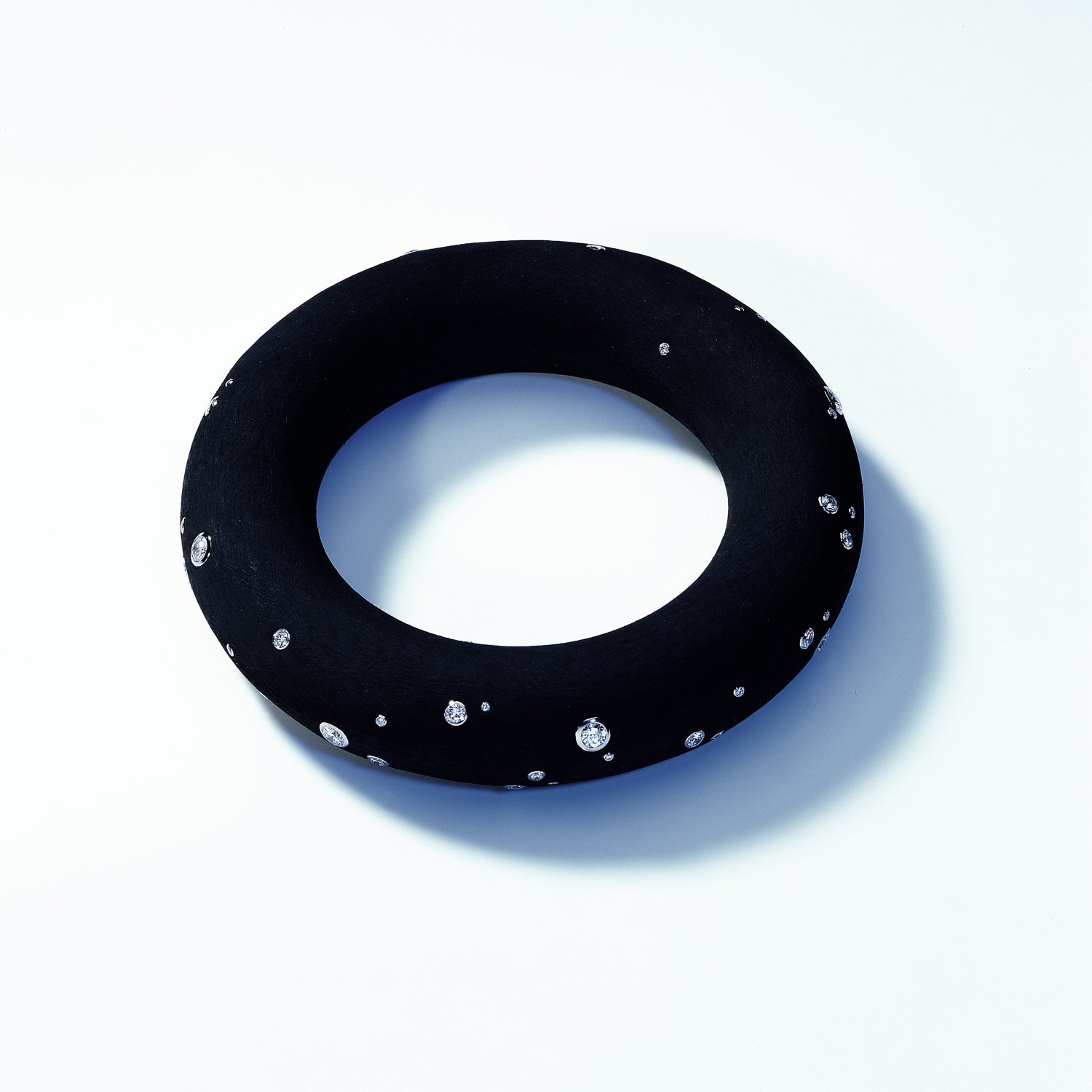 bangle made of 20 mm thick black rubber set with 61 round brilliant cut diamonds, total weight 4.25ct. H/Si, mounted in 18K gray gold bezels.