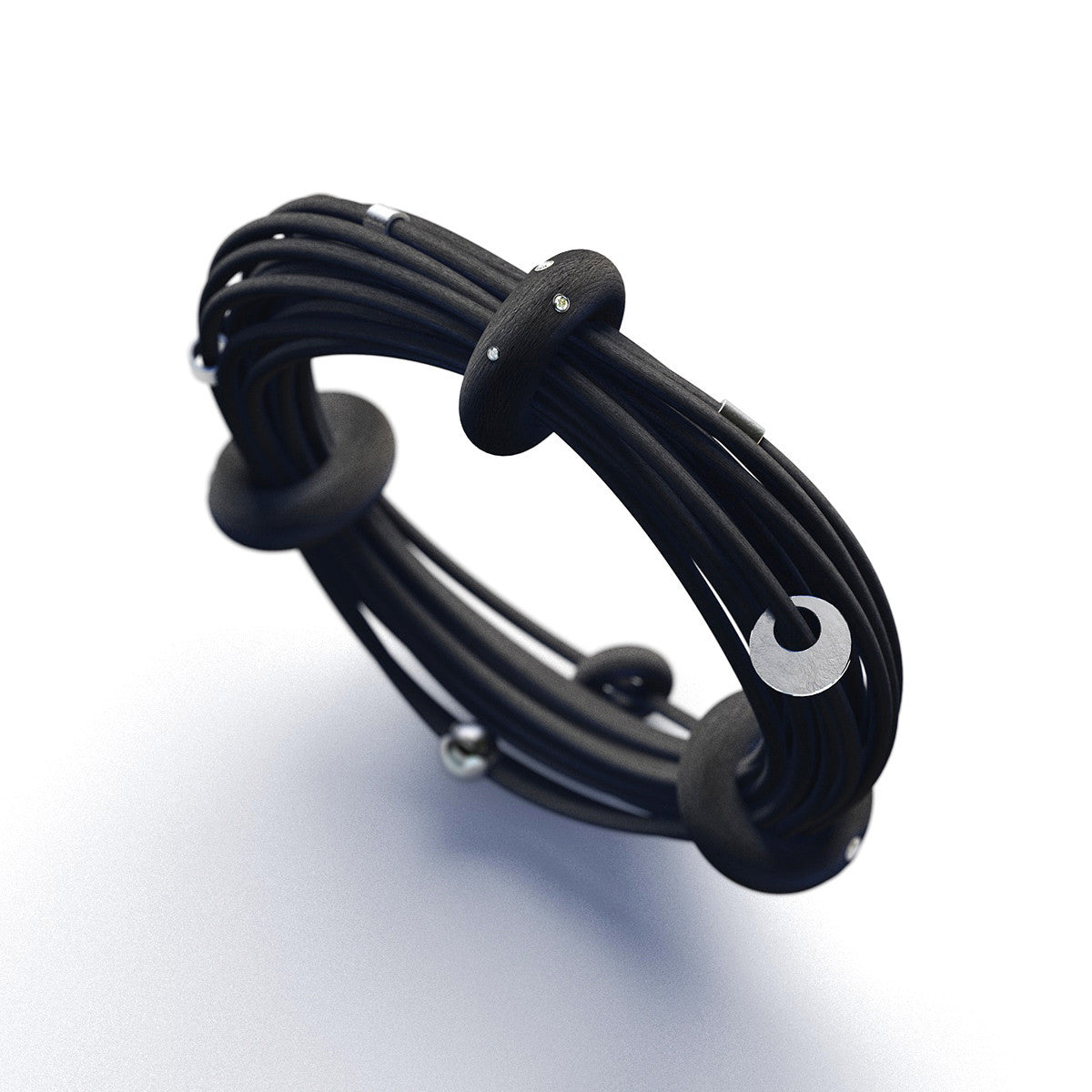bangle made of black rubber cord and rings. set with 9 round brilliant cut diamonds 0.14ct. H/Si, mounted in 18K gray gold bezels.