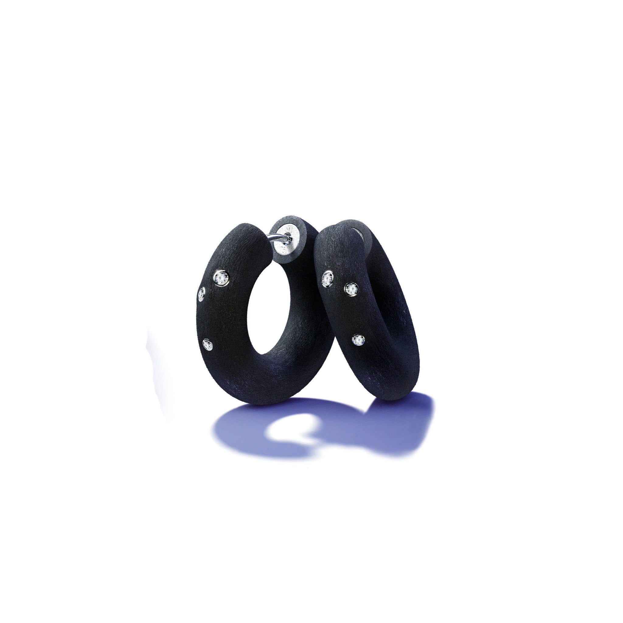 earrings 20 mm diameter, made of 6 mm thick black rubber set with 6 round brilliant cut diamonds, total weight 0,08ct. H/Si, mounted in 18K gray gold bezels.