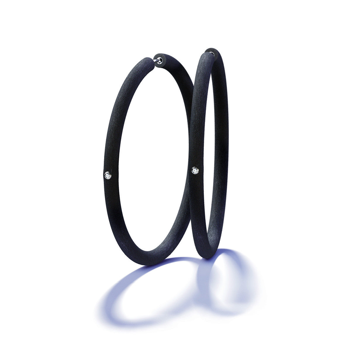earrings 58 mm diameter, made of 4 mm thick black rubber set with 2 round brilliant cut diamonds, total weight 0,04ct. H/Si, mounted in 18K gray gold bezels.