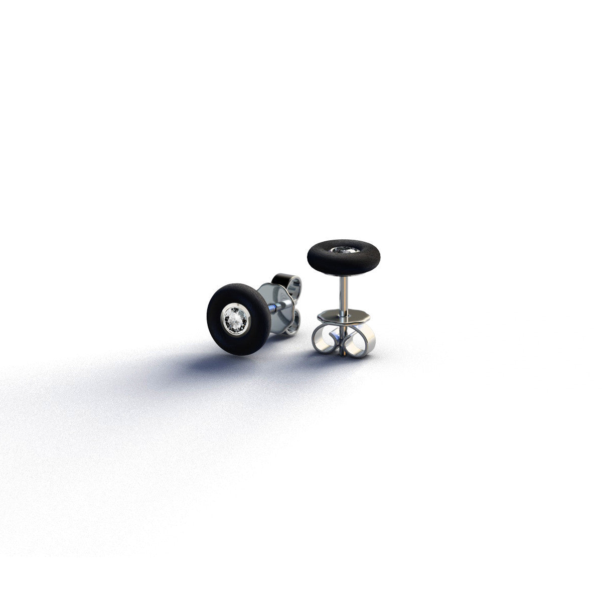 earrings studs, 5 mm diameter made of black rubber set with 2 round brilliant cut diamonds, total weight 0,12ct. H/Si, mounted in 18K gray gold bezels.