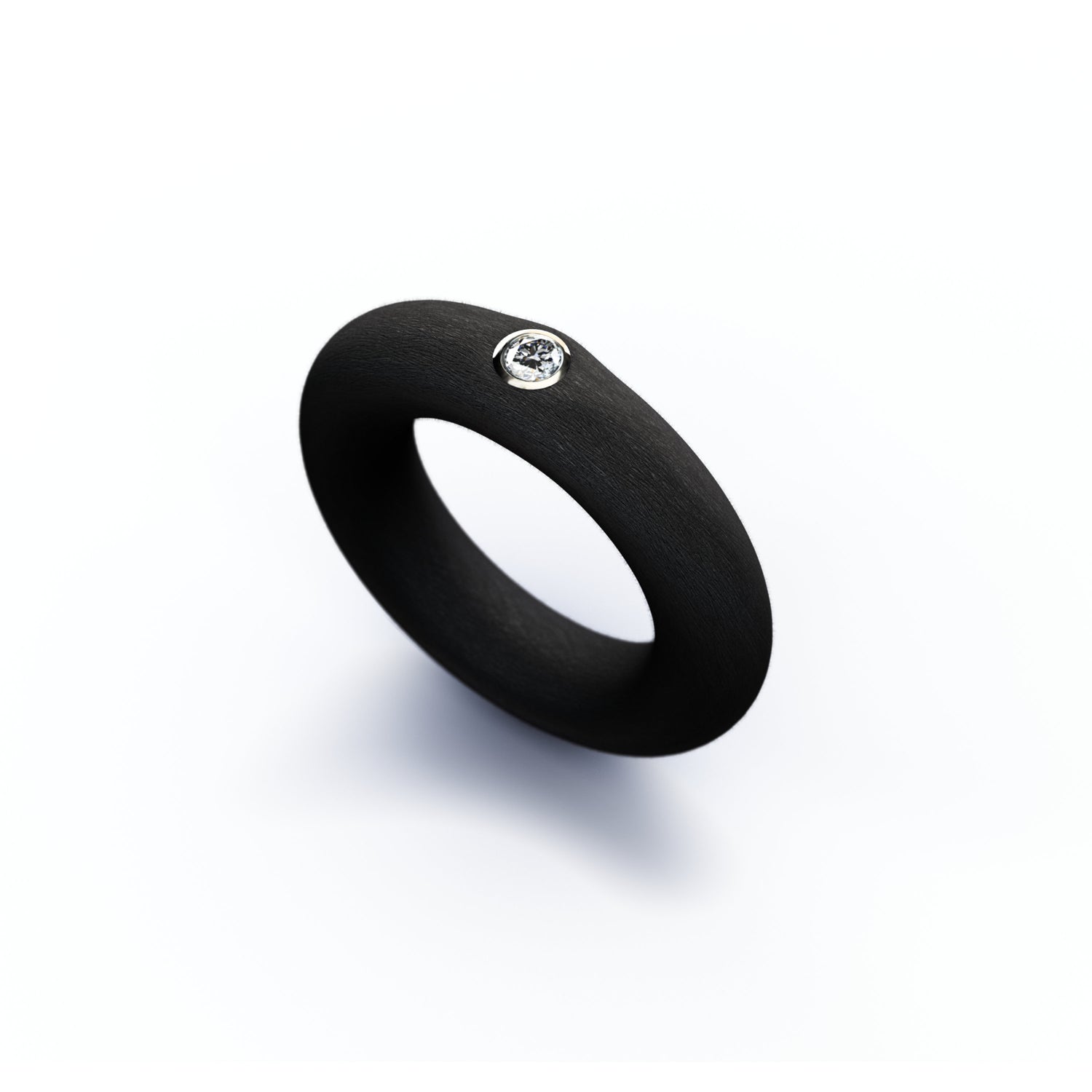 ring made of 6 mm diameter black rubber set with 1 round brilliant cut diamonds 0,10 ct. H/Si, mounted in a 18K gray gold bezel.