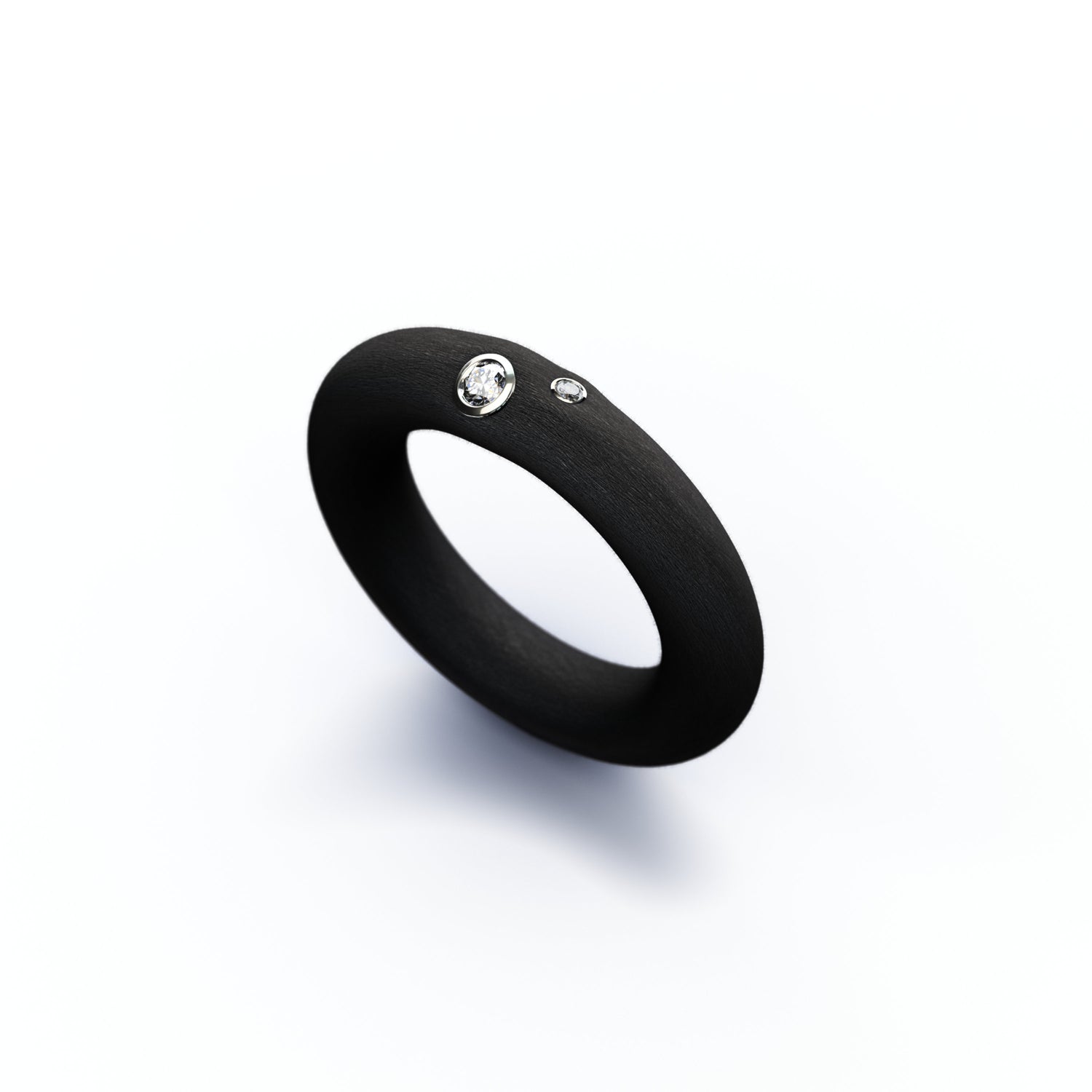 ring made of 5 mm diameter black rubber set with 2 round brilliant cut diamonds, total weight 0,07ct. H/Si, mounted in 18K gray gold bezels.