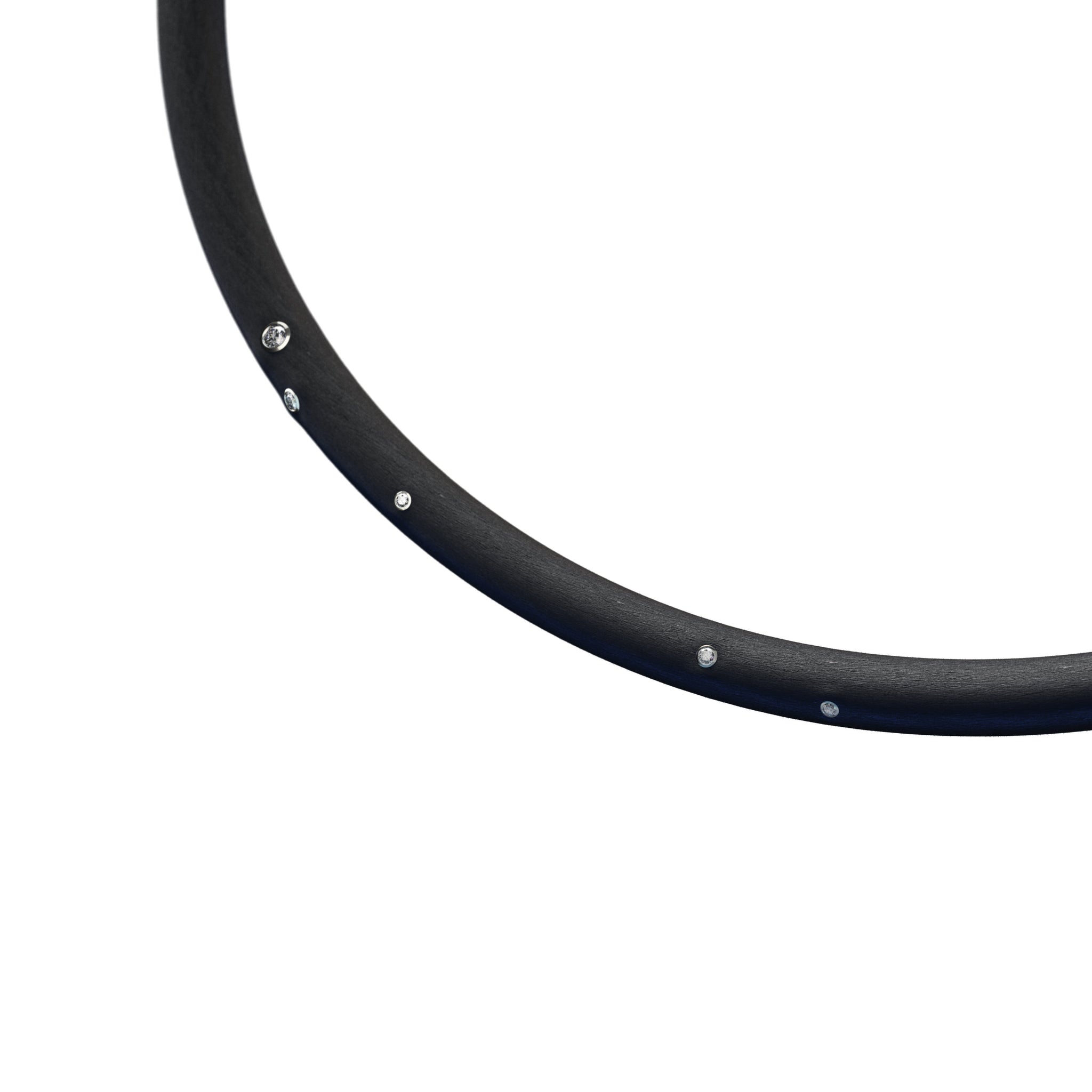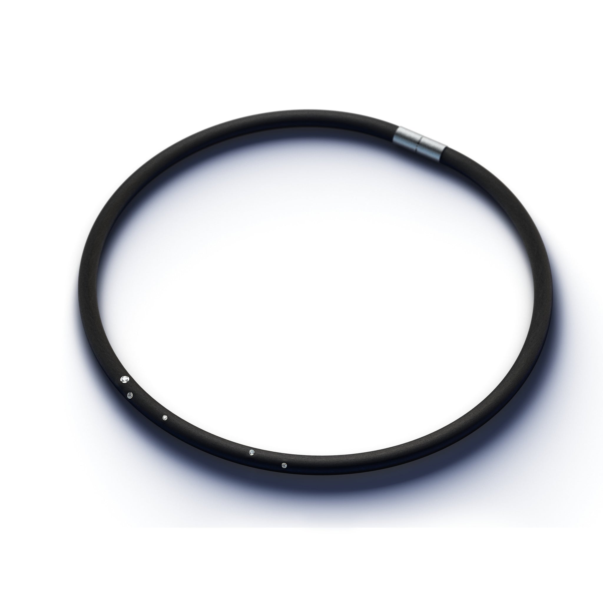 necklace made of 6 mm thick black rubber cord set with 5 round brilliant cut diamonds, total weight 0.08ct. H/Si, mounted in 18K gray gold bezels with a steel clasp.