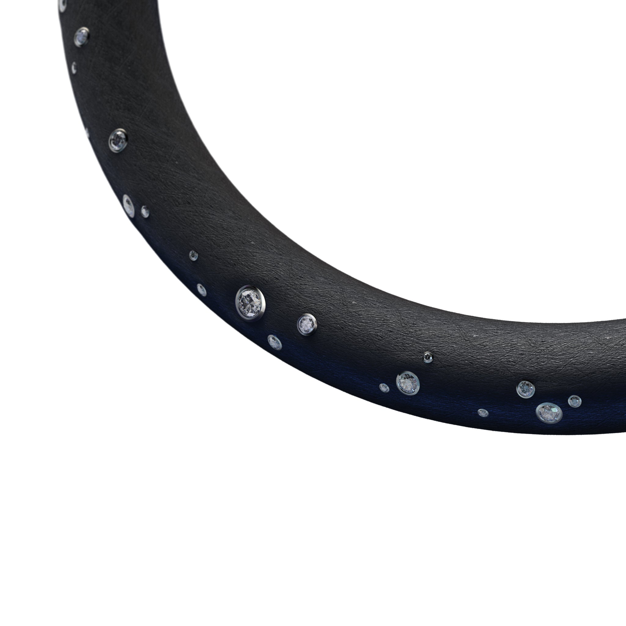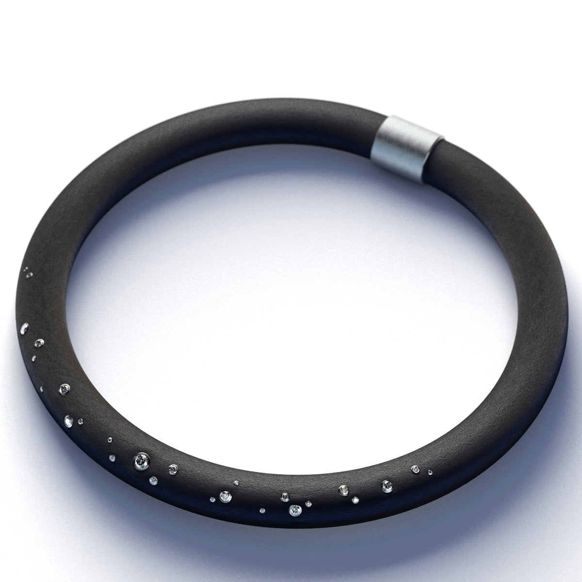 necklace made of 15 mm thick black rubber cord set with 26 round brilliant cut diamonds, total weight 1.29ct. H/Si, mounted in 18K gray gold bezels with a 18K gray gold clasp.