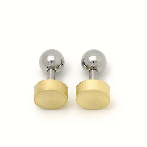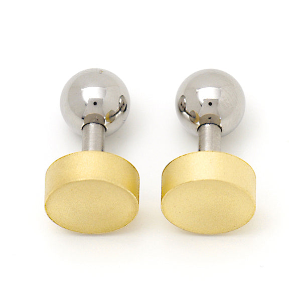 pair of cufflinks, with 12 mm diameter concave cylinders and 9 mm spheres.made of 18K yellow gold and stainless steel.slip in type, without a mechanism.
