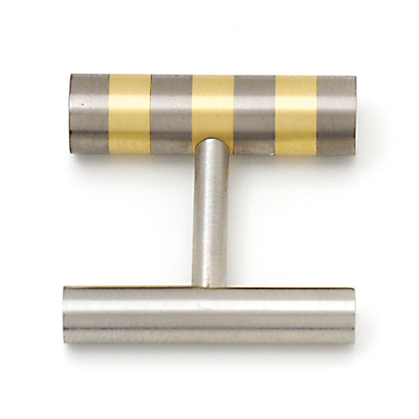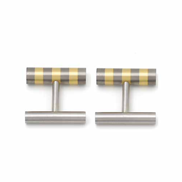 pair of cylindrical cufflinks, with a diameter of 7 mm and a length of 25 mm with tilting mechanism.made of 18K yellow gold, titanium and stainless steel.