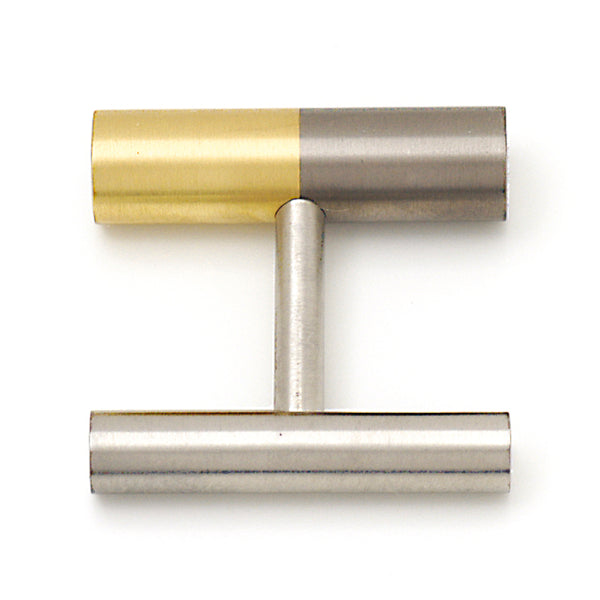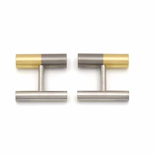 pair of cylindrical cufflinks, with a diameter of 7 mm and a length of 25 mm with tilting mechanism.made of 18K yellow gold, titanium and stainless steel.