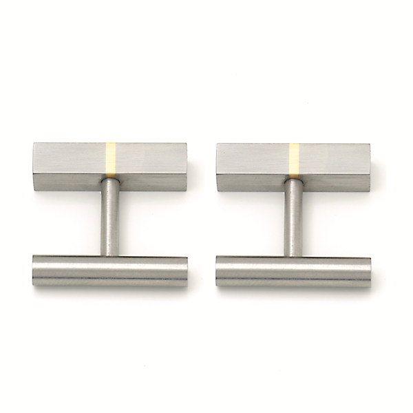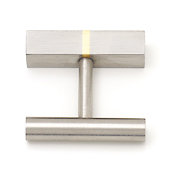 pair of square head cufflinks, 6 x 6 mm and a length of 25 mm with a tilting mechanism. made of 18K yellow gold and stainless steel.