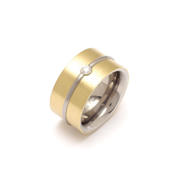 ring 12 mm wide made of 18K yellow gold and stainless steel set with a round brilliant cut diamond 0.05ct, vsi.