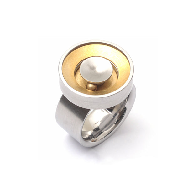 ring, 10 mm wide with a 21 mm disk on top and movable sphere made of 18K yellow gold and stainless steel.