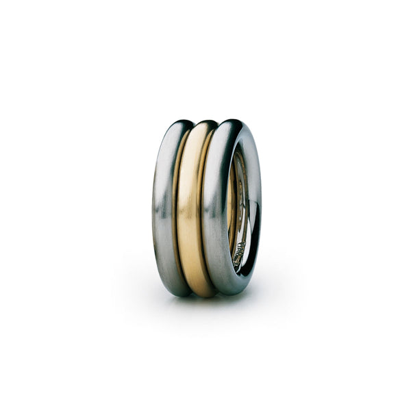 three loose rings, together 12 mm wide made of 18K yellow gold and stainless steel.