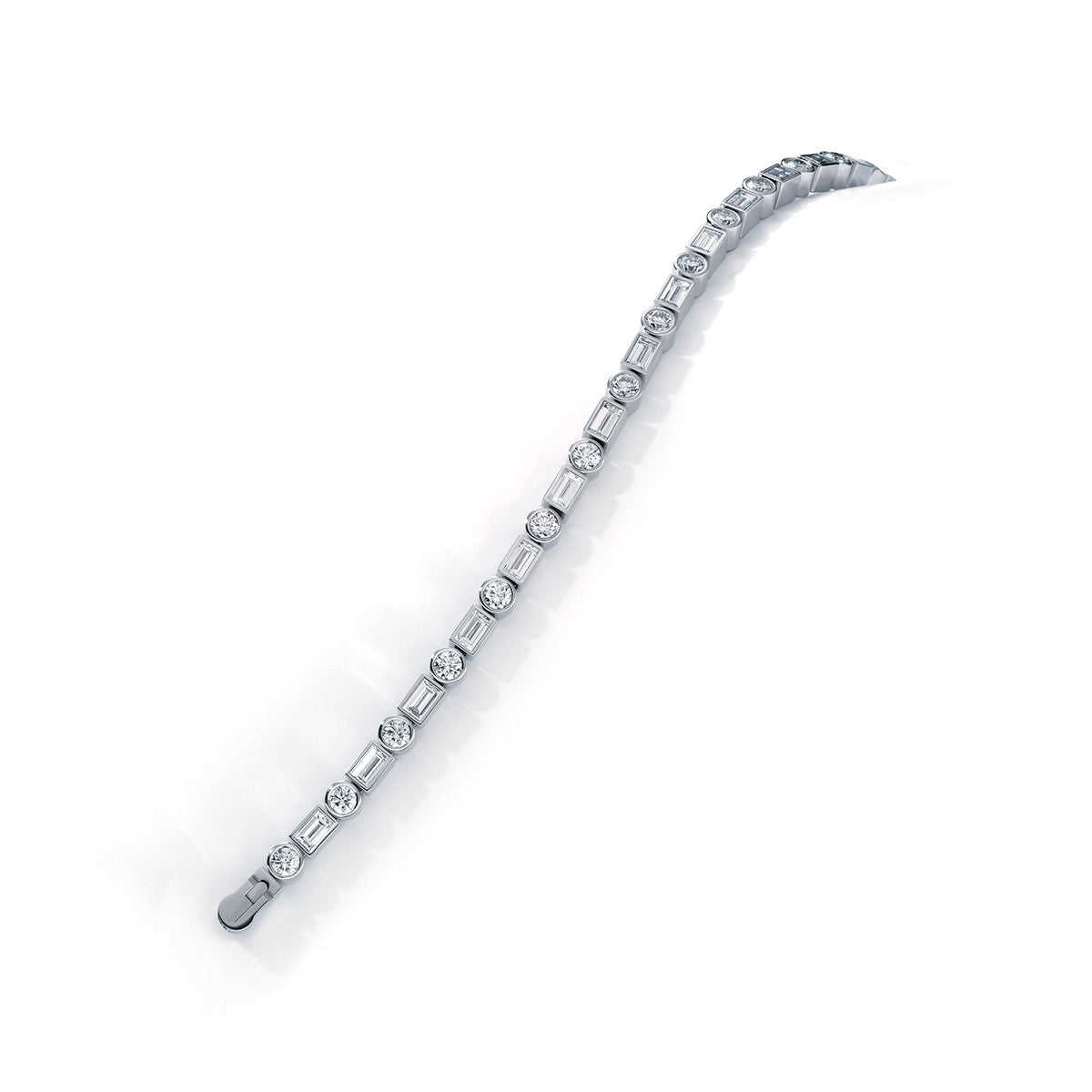 a diamond bracelet as a cool understatement and exquisitely elegant appearance, made of 950 platinum, set with 15 round brilliant cut diamonds 3.55 ct. total weight, F/vs and 15 baguette diamonds 4.50 ct. total weight, F/vvs.