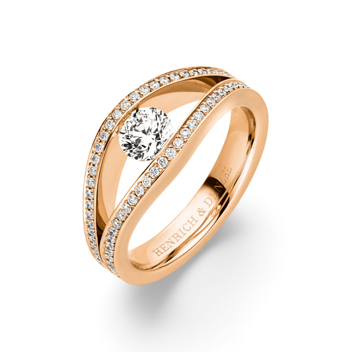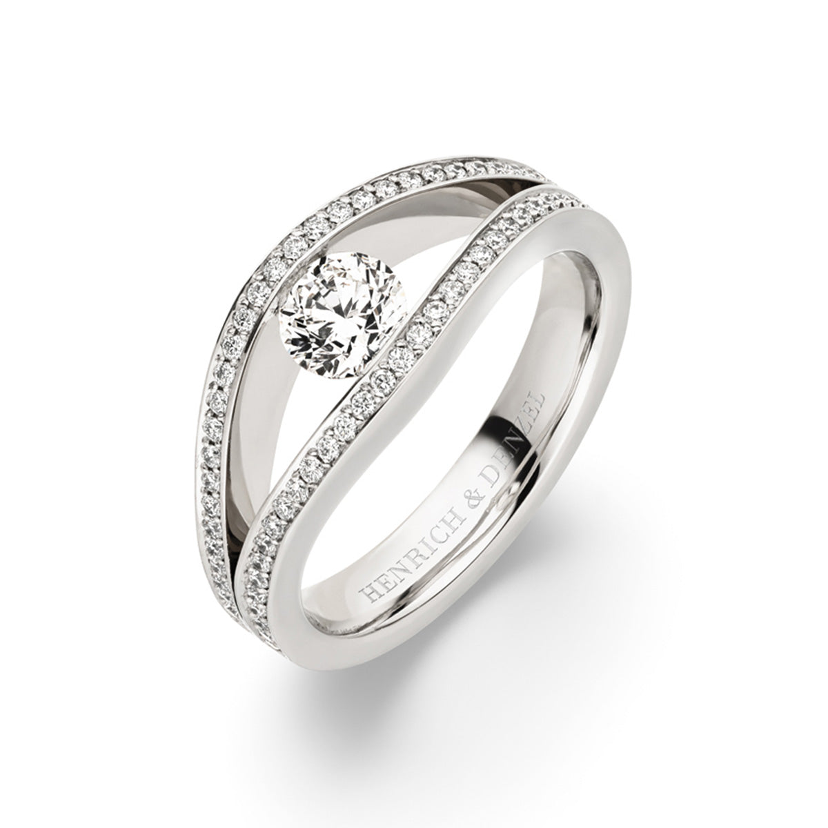 a captivating ring made of (please select your preferred metal).set with a round brilliant cut diamond 0.50 ct., F/vs1 in the center and pave set with 62 round brilliant cut diamonds 0.23 ct total weight, F/vs, on the sides.
