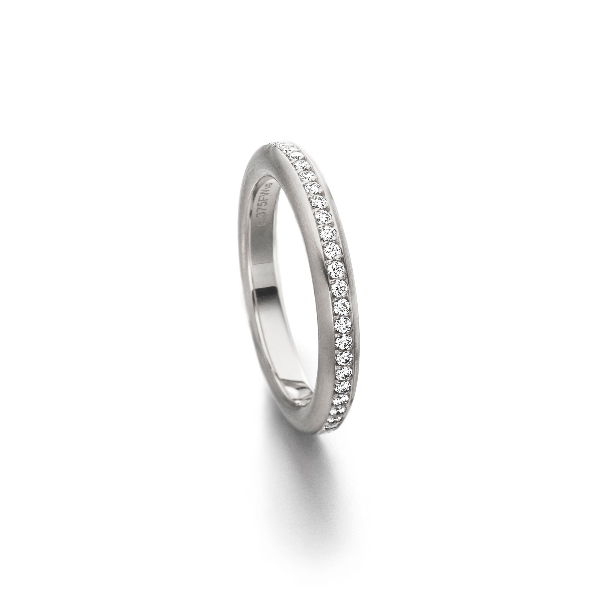 3.5 mm wide and 3 mm thick, made of 950 platinum or 18k rose gold set with approximately 50 round brilliant cut diamonds, 0.375 ct total weight, F/vs.