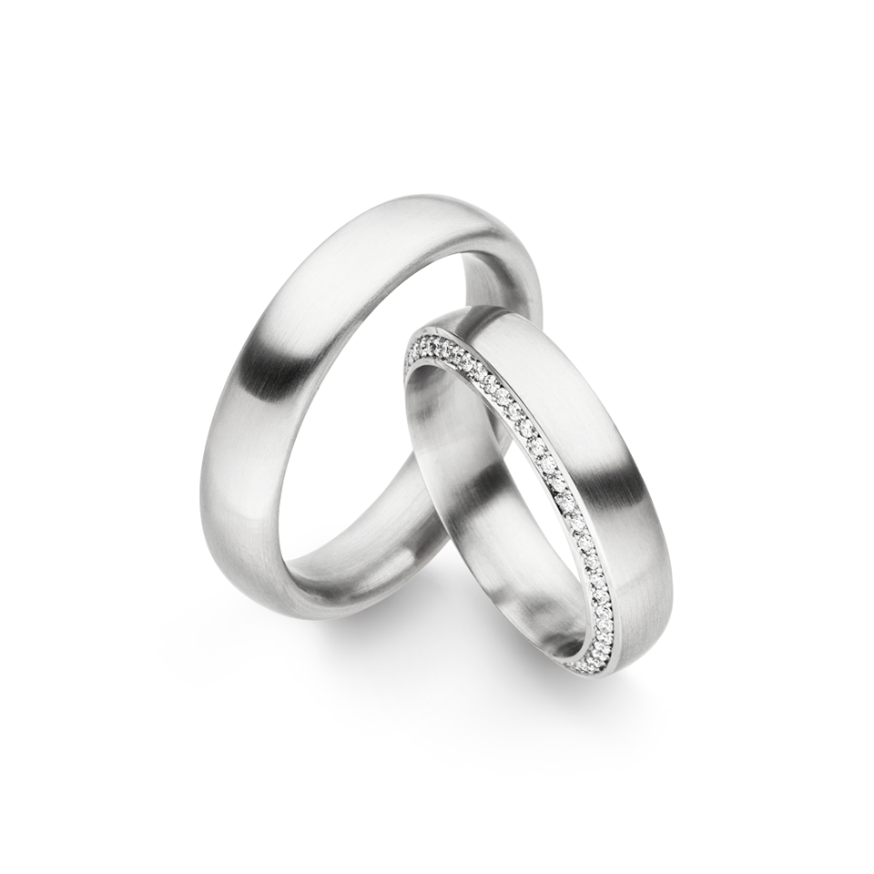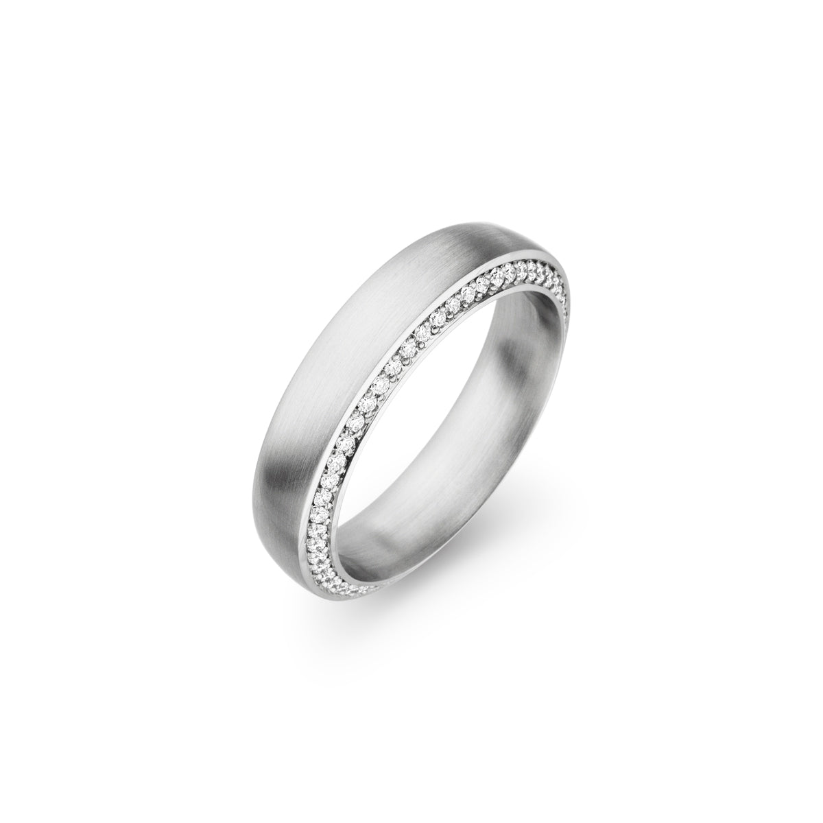 wedding band 5 mm wide made of 950 platinum. with the option to be pave set on one side with 52 round brilliant cut diamonds 0.225 ct. total weight, F/vs.