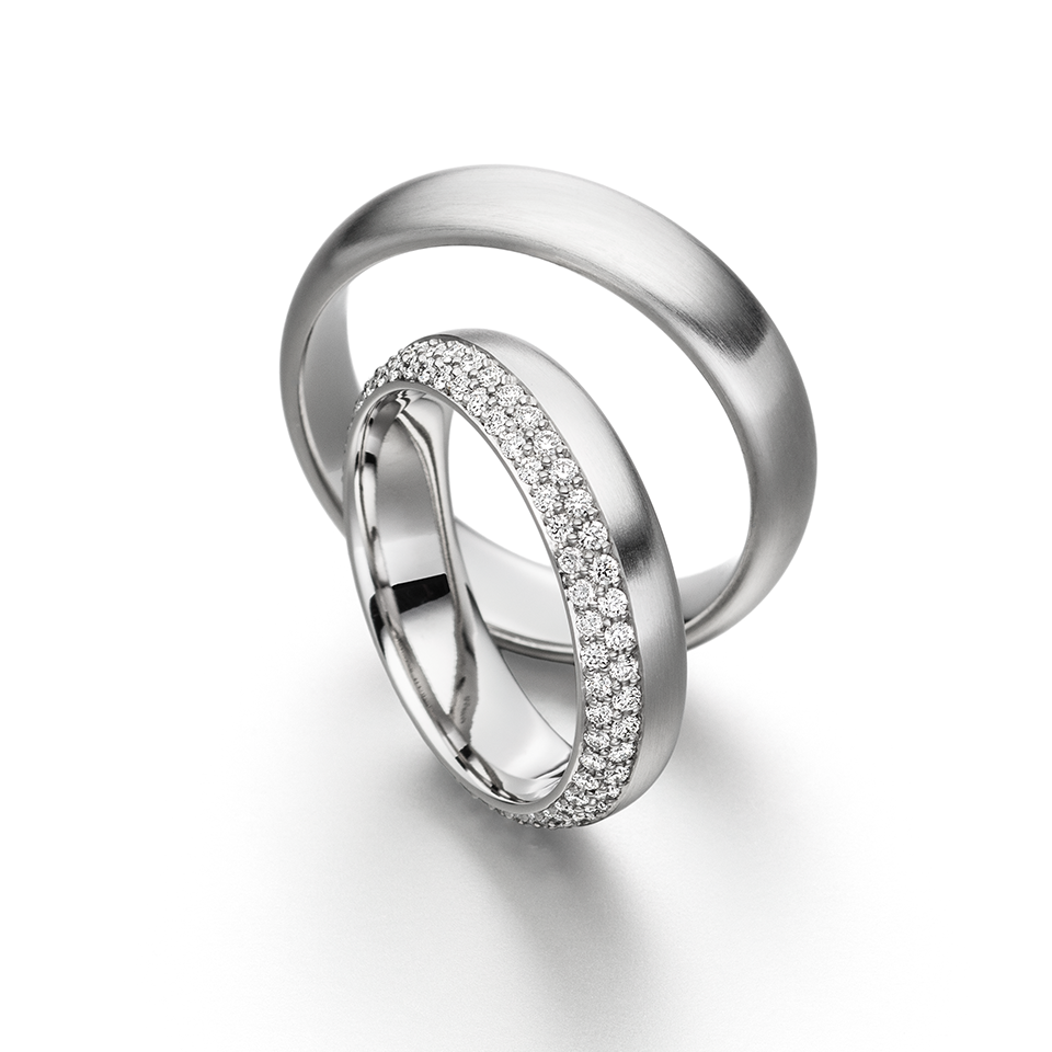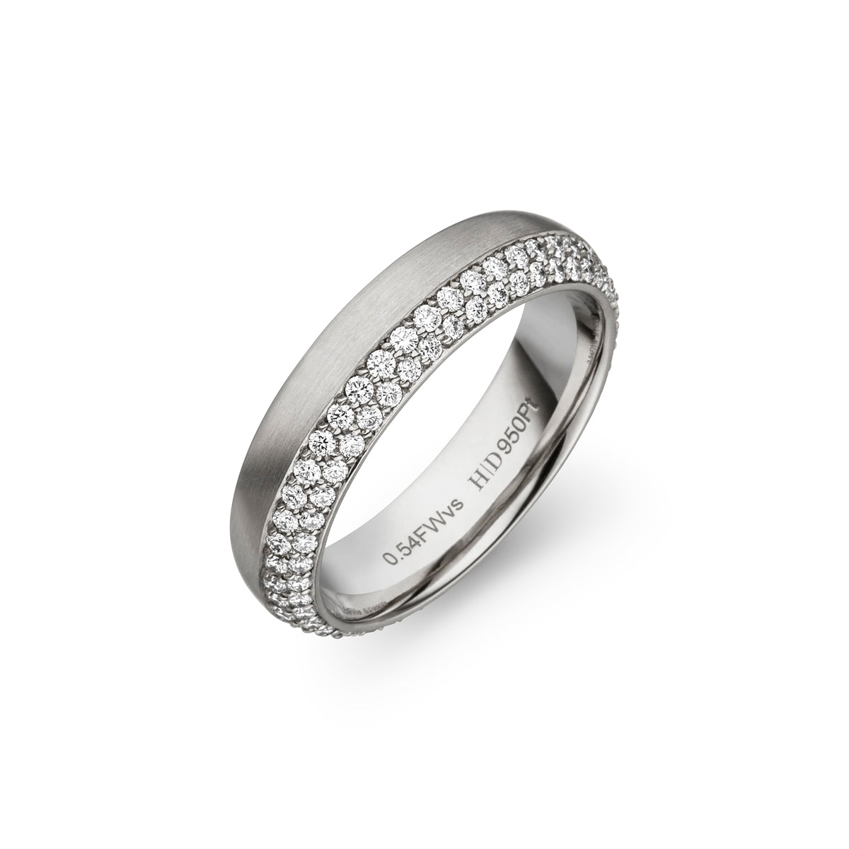 classically elegant. wedding band 5 mm wide made of 950 platinum. with the option to be pave set with 90 round brilliant cut diamonds 0.54 ct. total weight, F/vs.(number of diamonds varies depending on finger size)