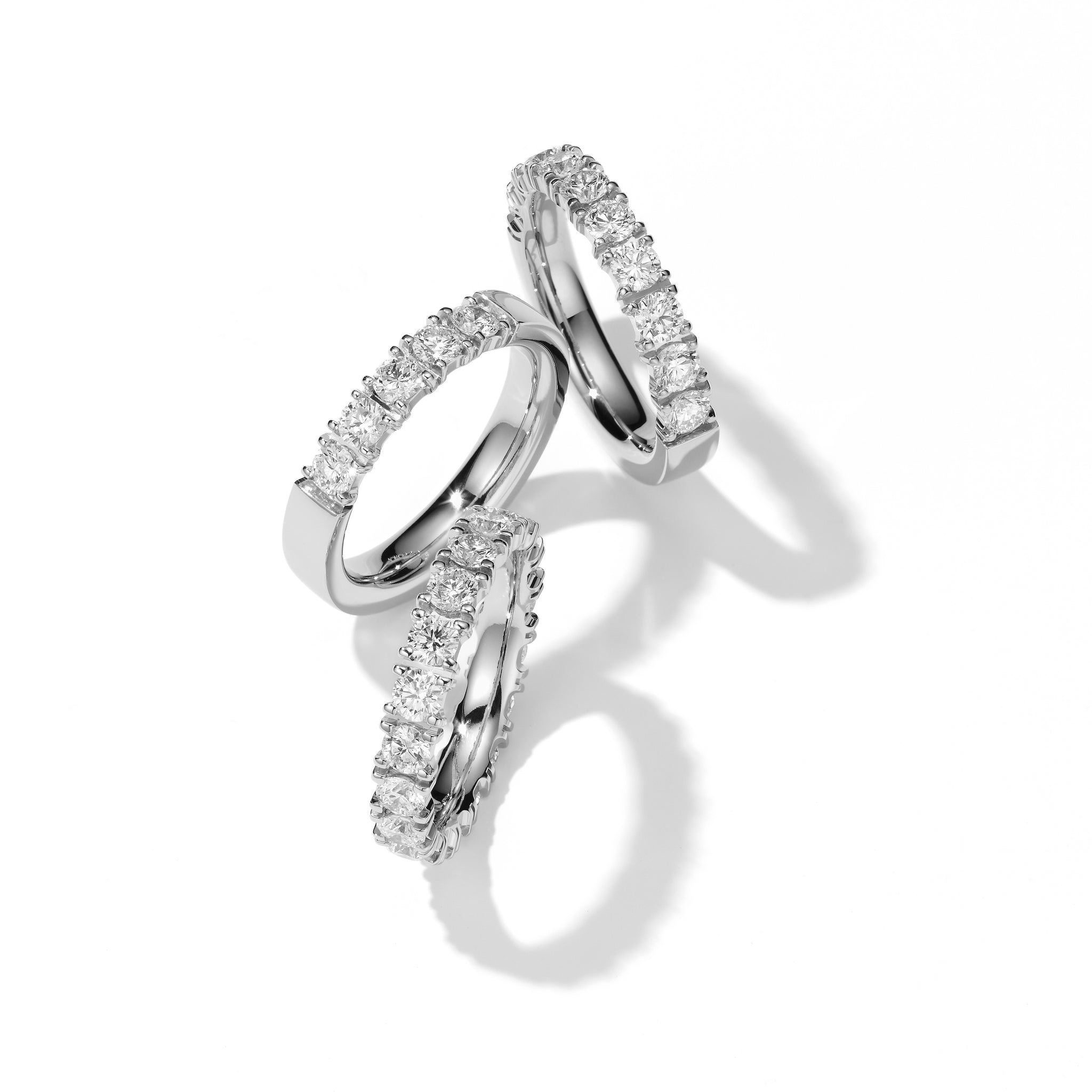 a compellingly elegant lasting memory band made in 950 platinum, set with five, ten or nineteen round brilliant cut diamonds, F/vs