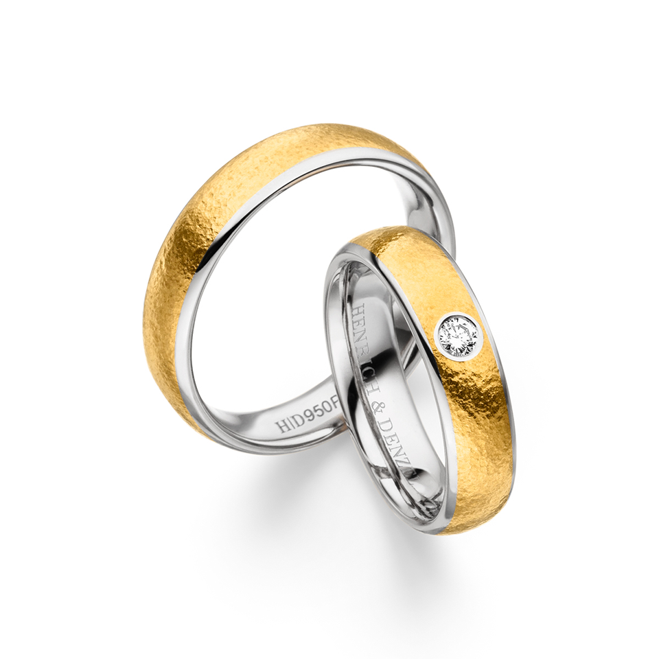 united forever. wedding band 5 mm wide made of 950 platinum and 24k gold. with the option to be set with a round brilliant cut diamond 0.07 ct., F/vs.