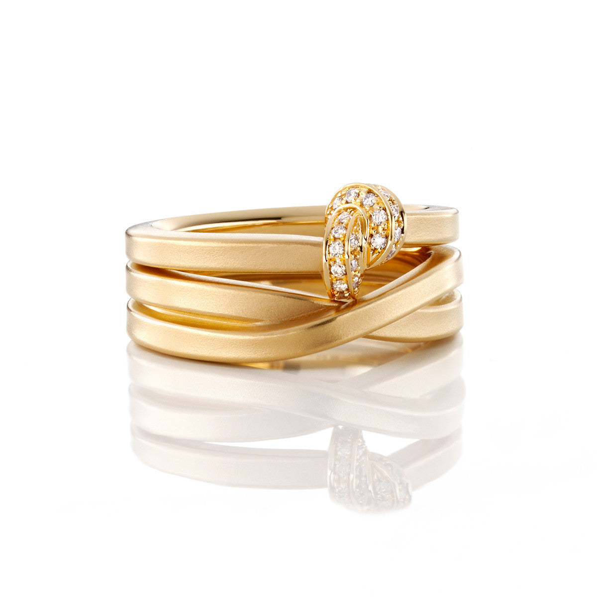 combination of two rings, knot (300.P) and endless (340), built with 2.5 mm wide strands, made of 18k rose gold and set with 0.15 ct. light brown round brilliant cut diamonds.