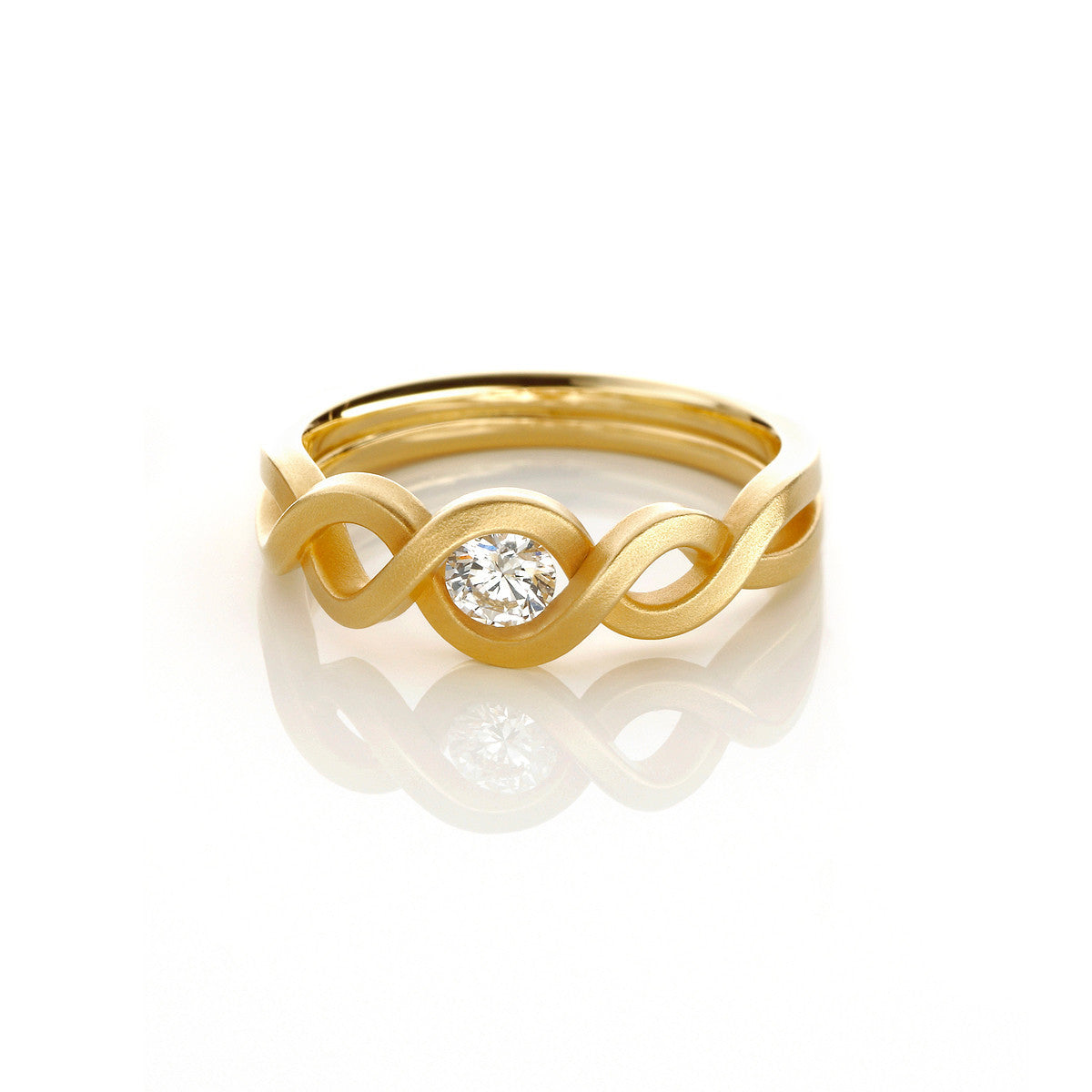 interwoven ring, built with two 1.5 mm wide strands, made of 18k yellow gold and set with 1 round brilliant cut diamond, G/Si1.
