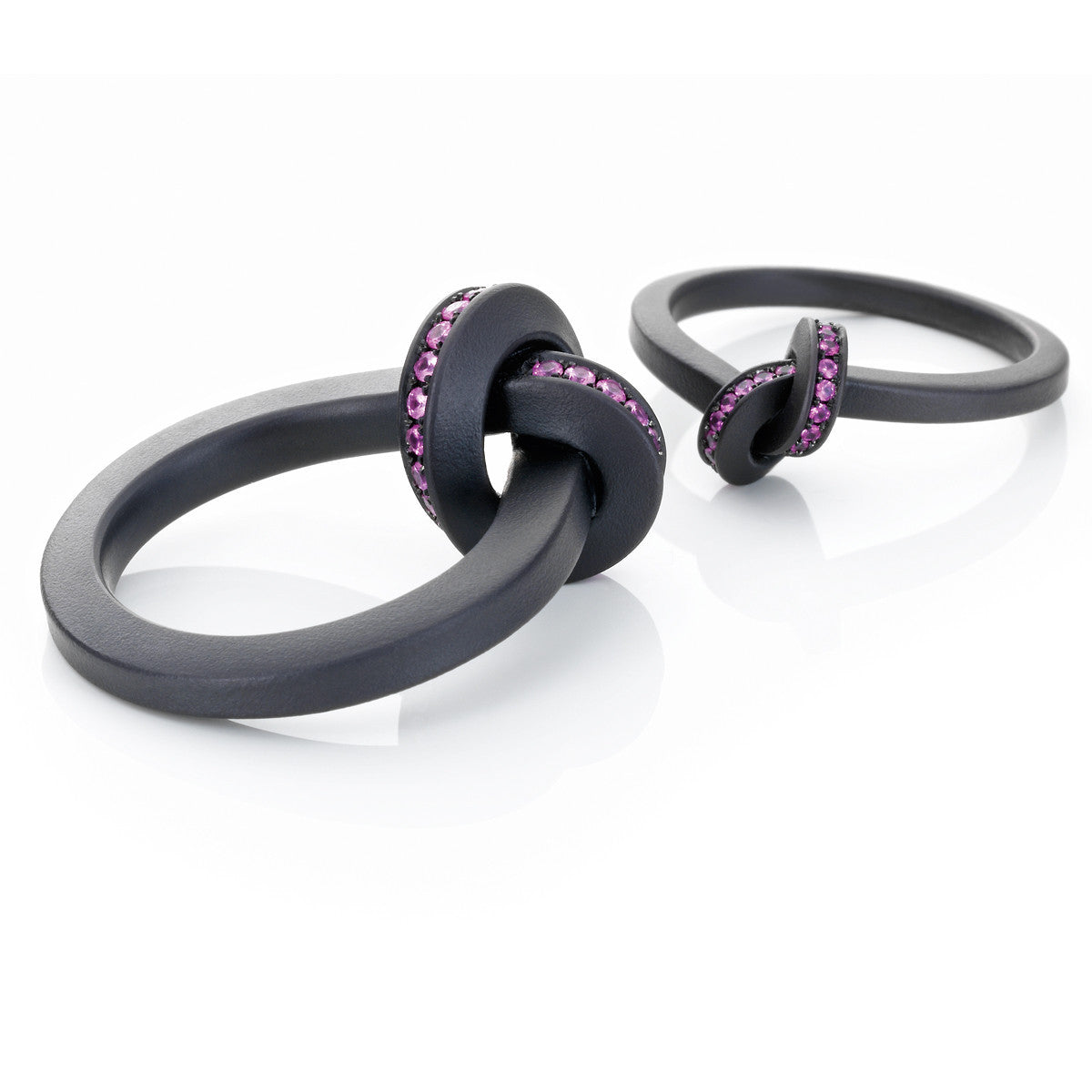 knot ring (300), built with a 3.2 mm or 1.5 mm wide strand, made of black anodized stainless steel and set with round brilliant cut pink sapphires.