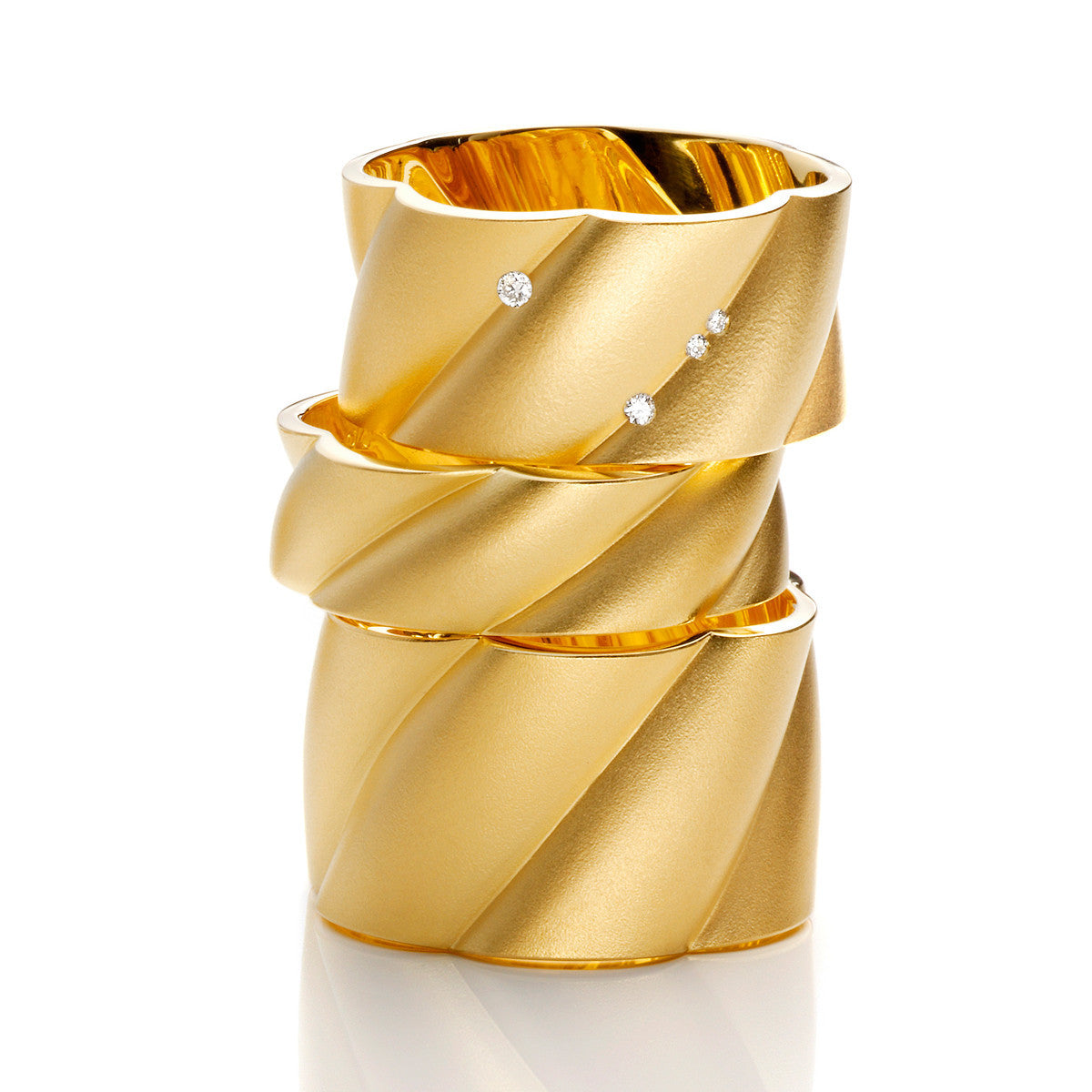wave ring in different widths, made of 18k yellow gold. the medium width is set with 4 diamonds G/Si1.
