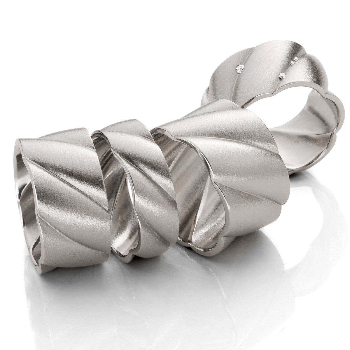 wave ring in different widths, made of high polished stainless steel. the medium width also available with the option of being set with 4 diamonds G/Si1.