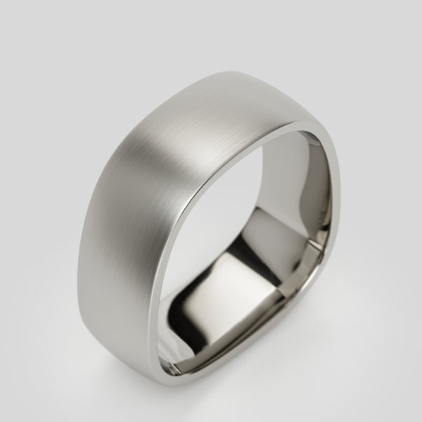 made of 950 platinum, this wedding band features a soft profile with a 8 mm band width and a matte finish.