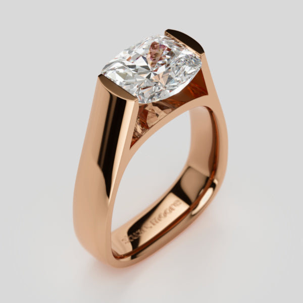 born from engineering innovation, suspension eliminates prongs entirely, securing the stone between two cold-worked metal walls — awarded best design of the decade by the platinum guild international.