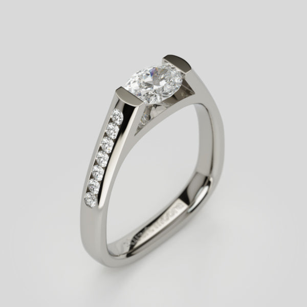 born from engineering innovation, suspension eliminates prongs entirely, securing the stone between two cold-worked metal walls — awarded best design of the decade by the platinum guild international.