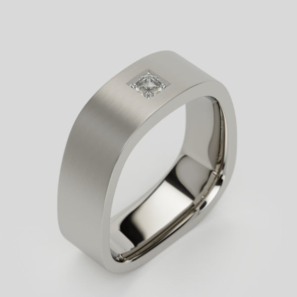 made of 950 platinum, this diamond wedding band features a hard profile with a 7 mm band and is set with a carré-cut diamond measuring approximately 4 x 4 mm.