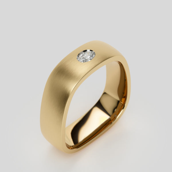 made of 18k yellow gold, this diamond wedding band features a soft profile with a 6 mm band and is set with a diamond measuring approximately 3 x 5 mm.
