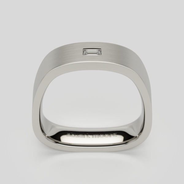 950 platinum diamond band, hard profile, 5 mm wide and burnish set with 1 baguette cut diamond, 0.06 ct., f/vvs.