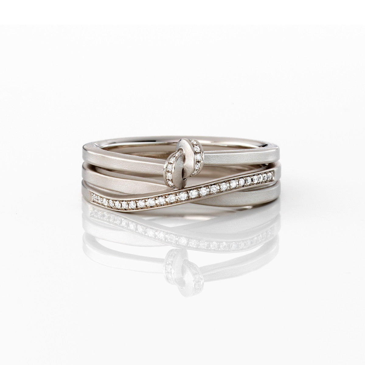 combination of two rings, knot (300.P) and endless (340.P), built with 1.5 mm wide strands, made of 18k white gold and set with 0.10 ct. round brilliant cut diamonds G/Si1